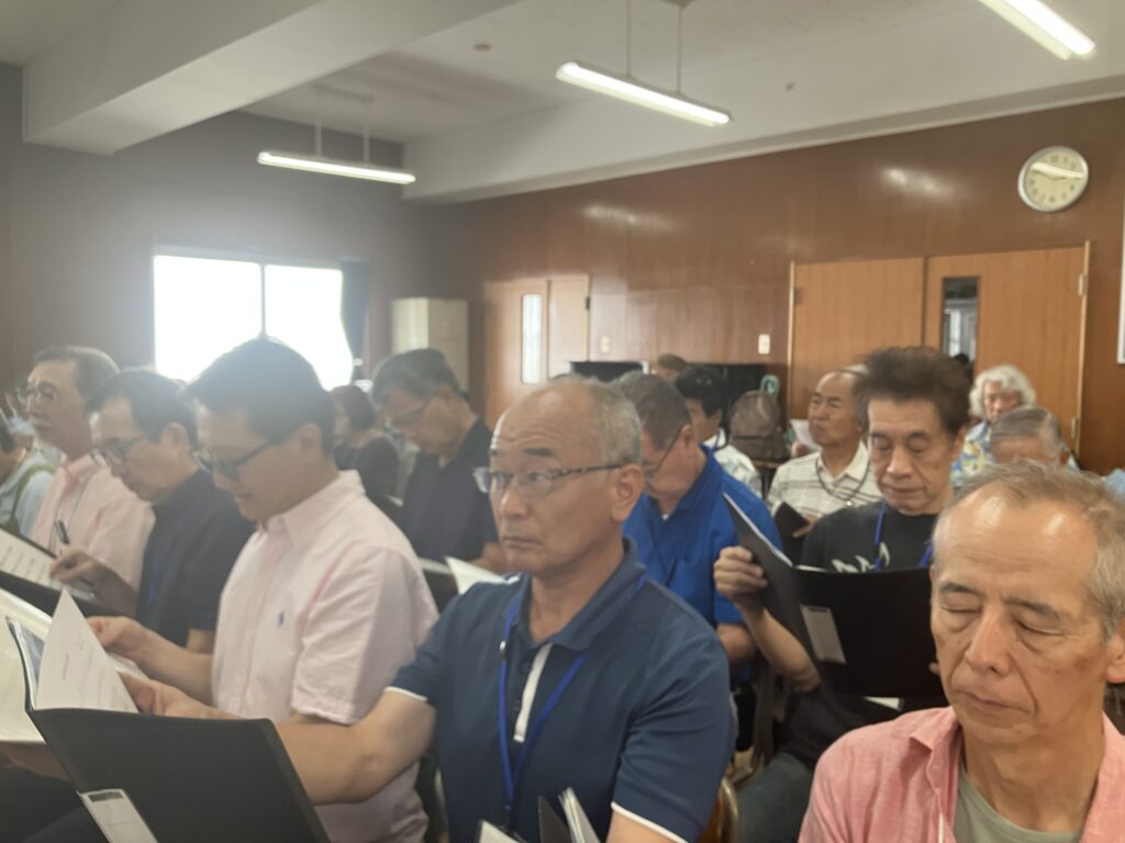 そこで、どちらから言うとでもなく、我々3人が校歌祭の舞台でうしお会の方々に混じって歌うことになったという次第。歌い慣れた校歌・応援歌の他に新曲を歌うこともあり、今年も6・7・9・10月の4回練習会がありました。我々は追高の校歌・応援歌は憶えられないので、本番ではむろん口パク。