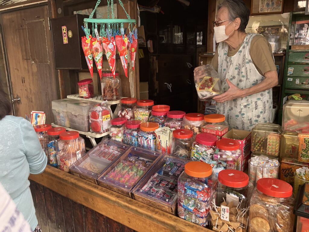 鬼子母神堂は案内処から歩いてすぐのところにあり、立派なお堂でした。境内には、時が止まったような駄菓子屋があり、きな粉菓子や糸付き飴、ラムネなど、懐かしいお菓子が並んでいました。店番のおばあさんは昭和15年生まれで、生まれたときからここに住んでいるそうです。B29を近くで見たことがあり、「追いかけられたこともあったけれど、二人乗りだった」と話してくださいました。戦火で周りは焼けたのに、鬼子母神堂だけは無傷だったとか。「神様のおかげだね」と、穏やかに笑う姿が印象的でした。