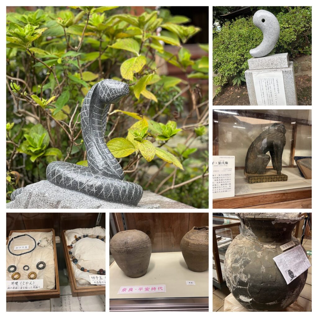 ご祭神の一柱は玉造りの神の天明玉命で勾玉の石の置物がそこかしこにある。また年替わりで飾られる十二支の置物は巳ではなくなんとコブラであったのが一興。隣接する郷土博物館には発掘調査による出土品が展示されていた。中に関東最古の七世紀の木彫りの狛犬の巻き毛は簡素、四股は長めの端正な姿で収まっていた。