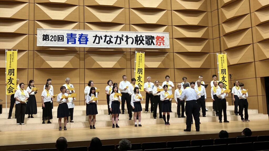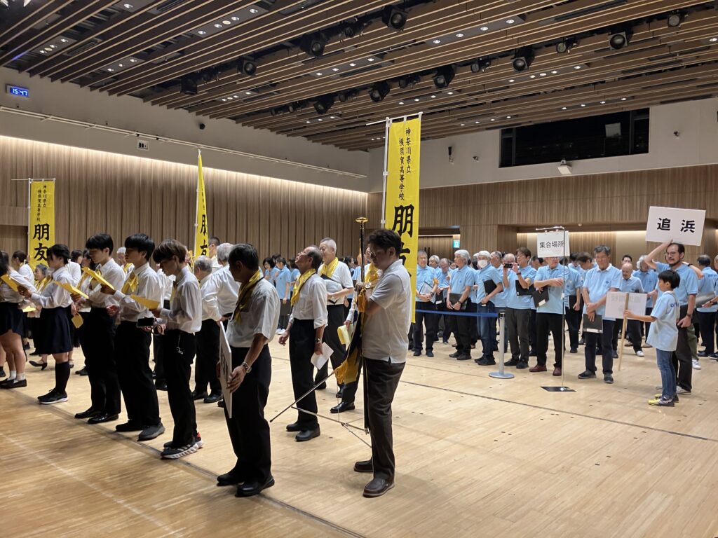 最初の出番校希望ヶ丘高校桜蔭会のリードで「箱根八里」を会場全員で合唱して、第一部が開幕。13校の出場後、休憩をはさんで第二部最初の吉田島高校同窓会のリードで神奈川県歌「光あらたに」の全員合唱。