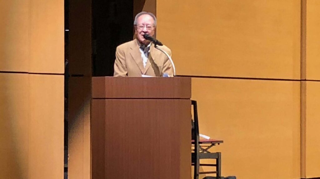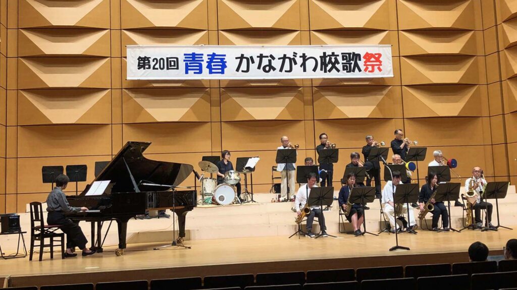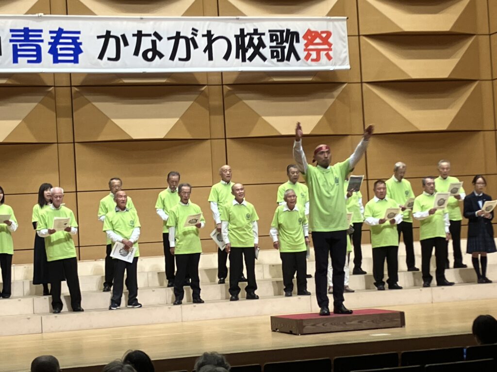 追浜高校うしお会は校歌と応援歌のみならず、毎年新たな曲を加えて演じています。今年は、「侍従川讃歌」が選曲されました。この曲は、廣瀬隆夫作詞補作、高橋揚一作曲、高橋克己プロデュースで私たち3人が作った歌です。追浜高校うしお会のスタッフの皆様から、ぜひ、壇上に上がって歌って欲しいというリクエストがありました。