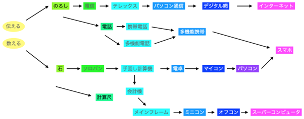 スマホは、ピザの注文もできるし、電車に乗ることも、音楽を聞くことも、おしゃべりをすることも、ビデオ会議をすることもできますが、スマホがこのような計算機の仲間だと言われても信じがたいと思います。生き物の系統樹をたどりますとバクテリアまで遡れますが、みんなが便利に使っているスマホのルーツをたどると、間違いなく計算機に行き着くのです。