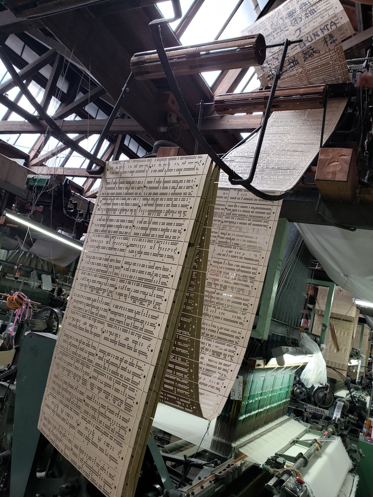 京都の西陣織の機械をご覧になった方はご存知かと思いますが、西陣織の布を織るために細長い紋紙(もんがみ)という厚紙が使われています。その厚紙に空けられた穴の通りに美しい模様が織り上げられます。紋紙を交換すると違った模様の西陣織が織りあがります。ノイマン式のコンピューターは、これと良く似た原理で動いているのです。