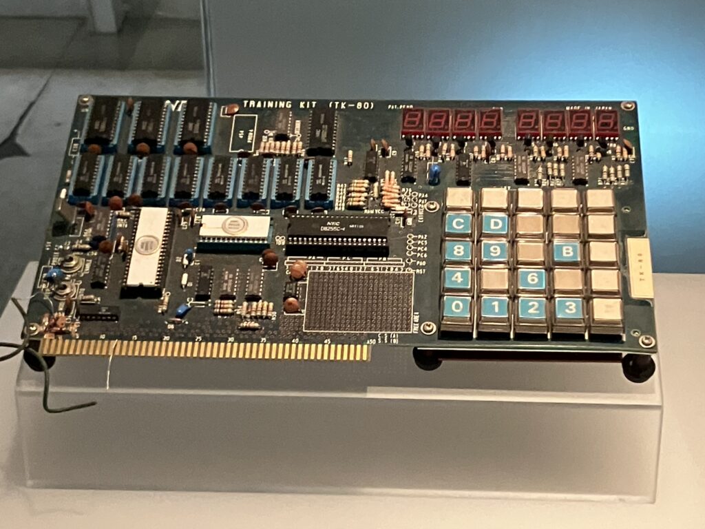 日本では、1976(昭和51)年に、当時まだほとんど知られておらず、そもそも需要すら存在しなかったマイクロプロセッサというものの需要を掘り起こすため、NECが8080のトレーニングキットを商品化しました。μCOM-80とは、当時NECがインテルからライセンスを受けて製造していた8080の製品名です。CPUやコンデンサなどの部品をプリント基板にはんだ付けして組み立てるキットで、マイコンシステムを開発する企業の技術者などが購入することを想定していました。