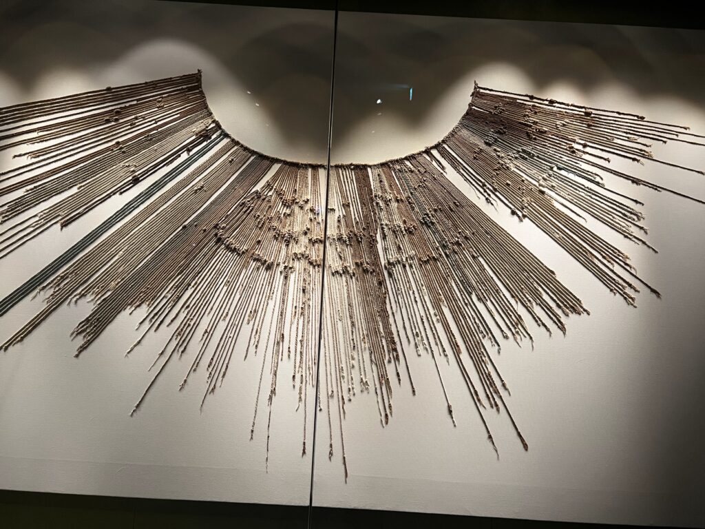 また鳥、蛇、猫を合体させた想像の動物「ムーンアニマル」には、人々の強さへの憧れが見えます。金と銀を張り合わせる高度の技術を要するセレモニーボールや儀式に使われた土器、そして戦勝記が描かれた精巧な焼き物。勝利者が敗者を辱める残酷なまでの描写も、当時の厳しい生存競争を物語っています。続くチムー文化(西暦900年~1470年頃)の黄金の装身具は、王の威厳をしめすとともに、先祖の加護によって身体を守るためのものでした。文字を持たなかったインカの人々が、紐の結び目「キープ」によって情報や歴史を記録していたという事実も、彼らの知恵を雄弁に物語っています。