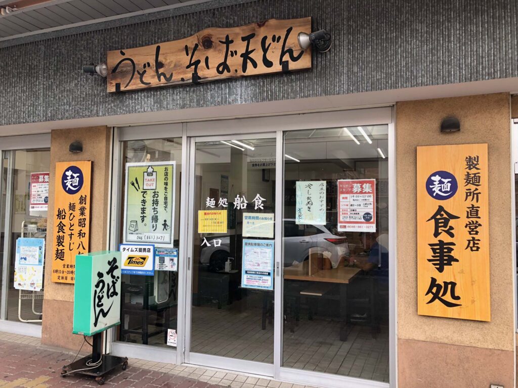 今月は京急田浦駅近くの船越町交差点から船越小学校下の道を進んで右に曲がったところにある老舗の製麺所直営蕎麦店「船食製麺」の「天ぷら蕎麦」と「天ぷら盛り合わせ」です。